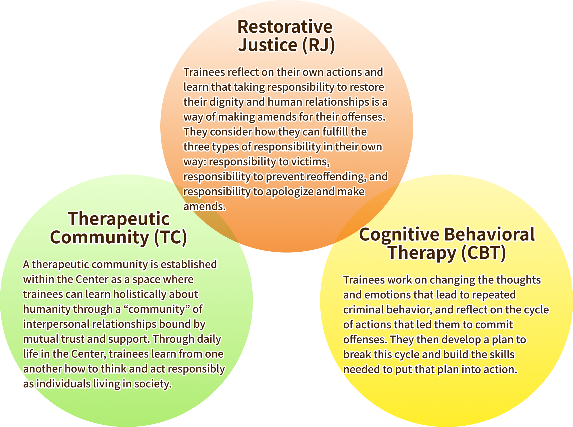 In addition to cognitive behavioral therapy and a therapeutic community program—practices proven to reduce recidivism rates in Europe and the United States—the Center incorporates the principles of restorative justice to encourage the rehabilitation and reform of trainees.